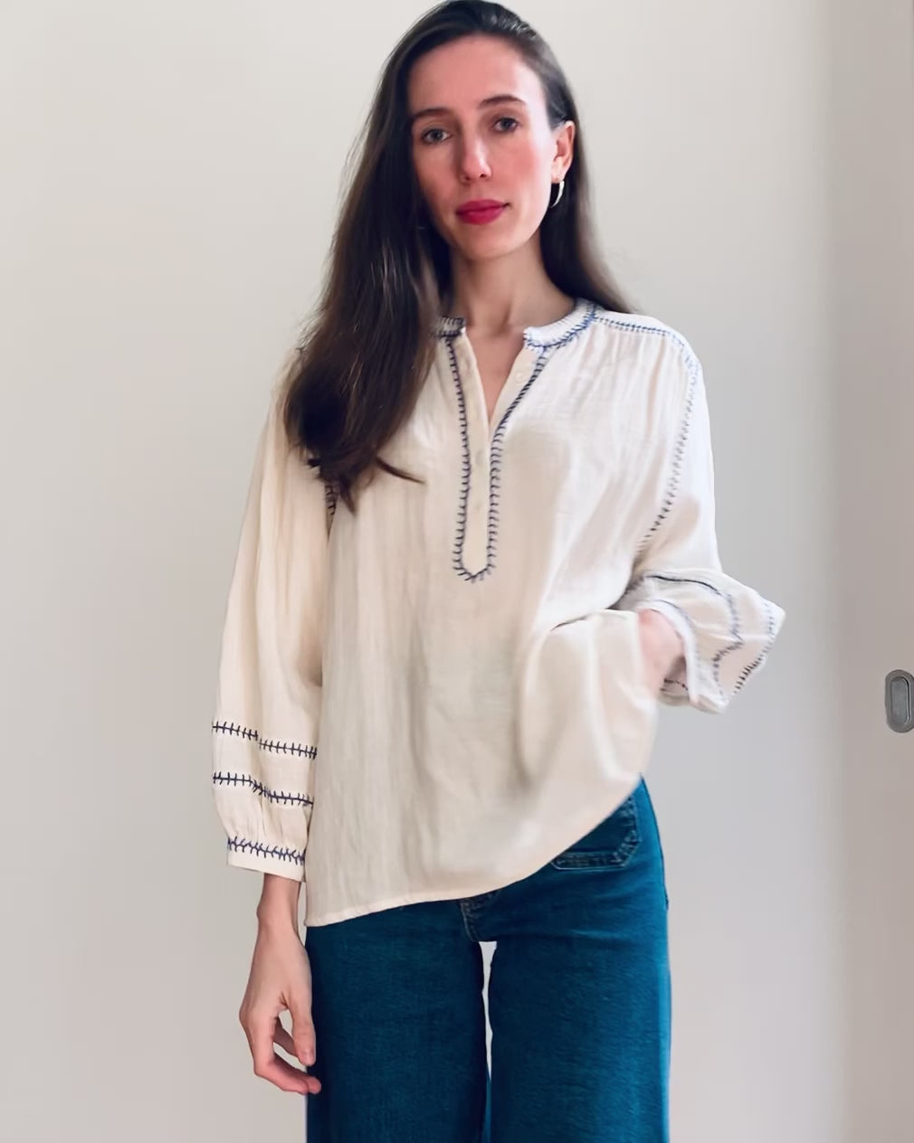 This blouse has hand embroidered "feather stitching at seams to give a stunning contrasting effect. Based on our best selling Amelie blouse shape, this is a loose fit with bracelet length sleeves.